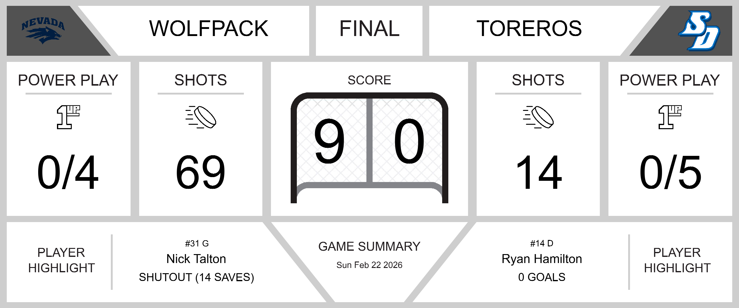 The University of Nevada-Reno Wolfpack delivered an astounding performance on their home ice, Reno Ice, Sunday night, shutting out the University of San Diego Toreros in a 9-0 victory. The Wolfpack’s offensive prowess was on full display as they outshot the Toreros by a staggering 69-14.
